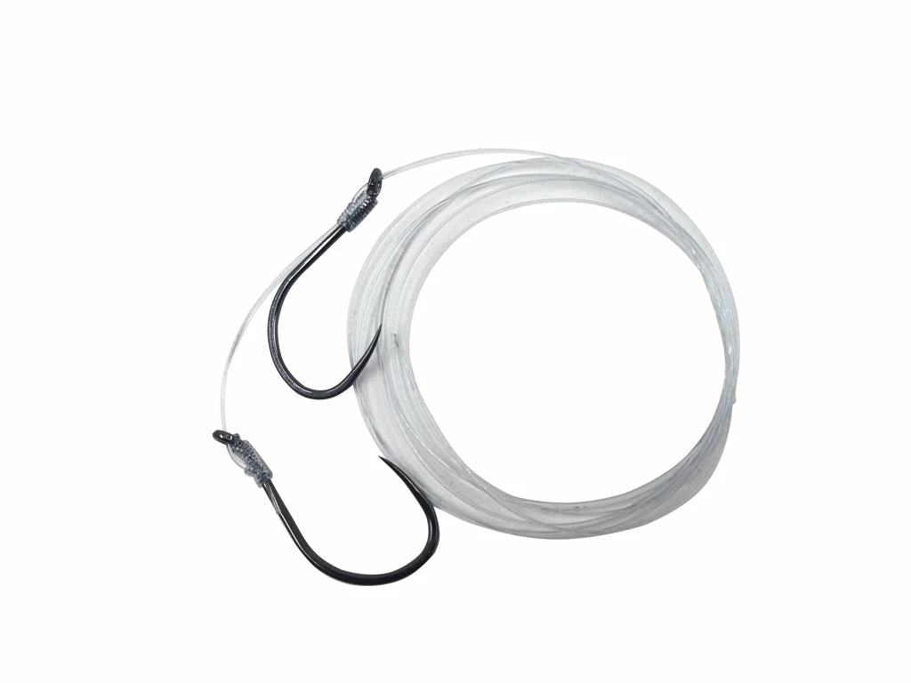 #3 Treble Hi Carbon Hook & 5/0 Barbless Beak Hook. Leader is 50 lbs test on Main and Trailer. Spacing on Trailer is 1-1/2″ eye to eye.
