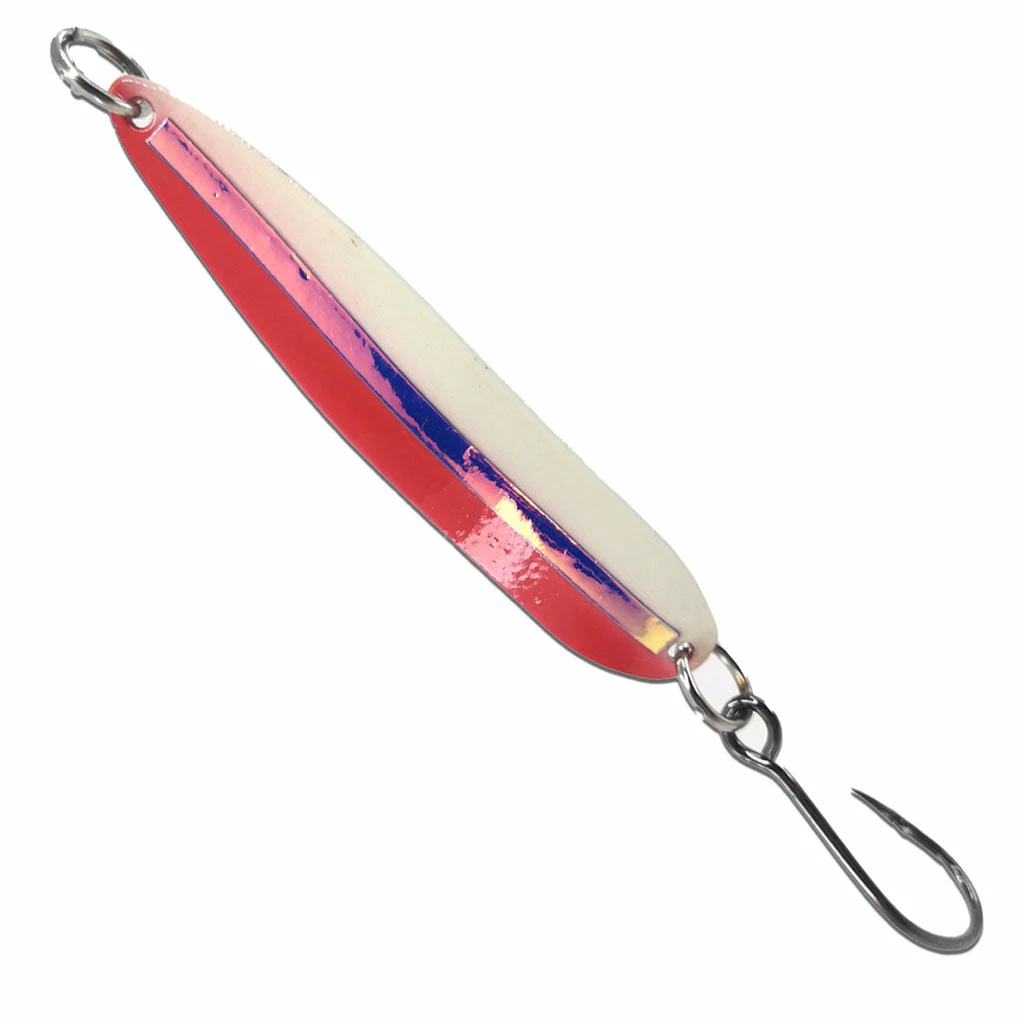 The Gibbs Skinny G is a light weight trolling spoon. It mimics small bair fish and has an erratic wounded action that changes frequently. It features a lifelike eye, welded rings and a Mustad Ultra Point Hook. The Skinny G is available in Glow or Nickel finishes with 13 vibrant colours. The spoon is 1/4oz and can be trolled at speeds from 2mph and faster.